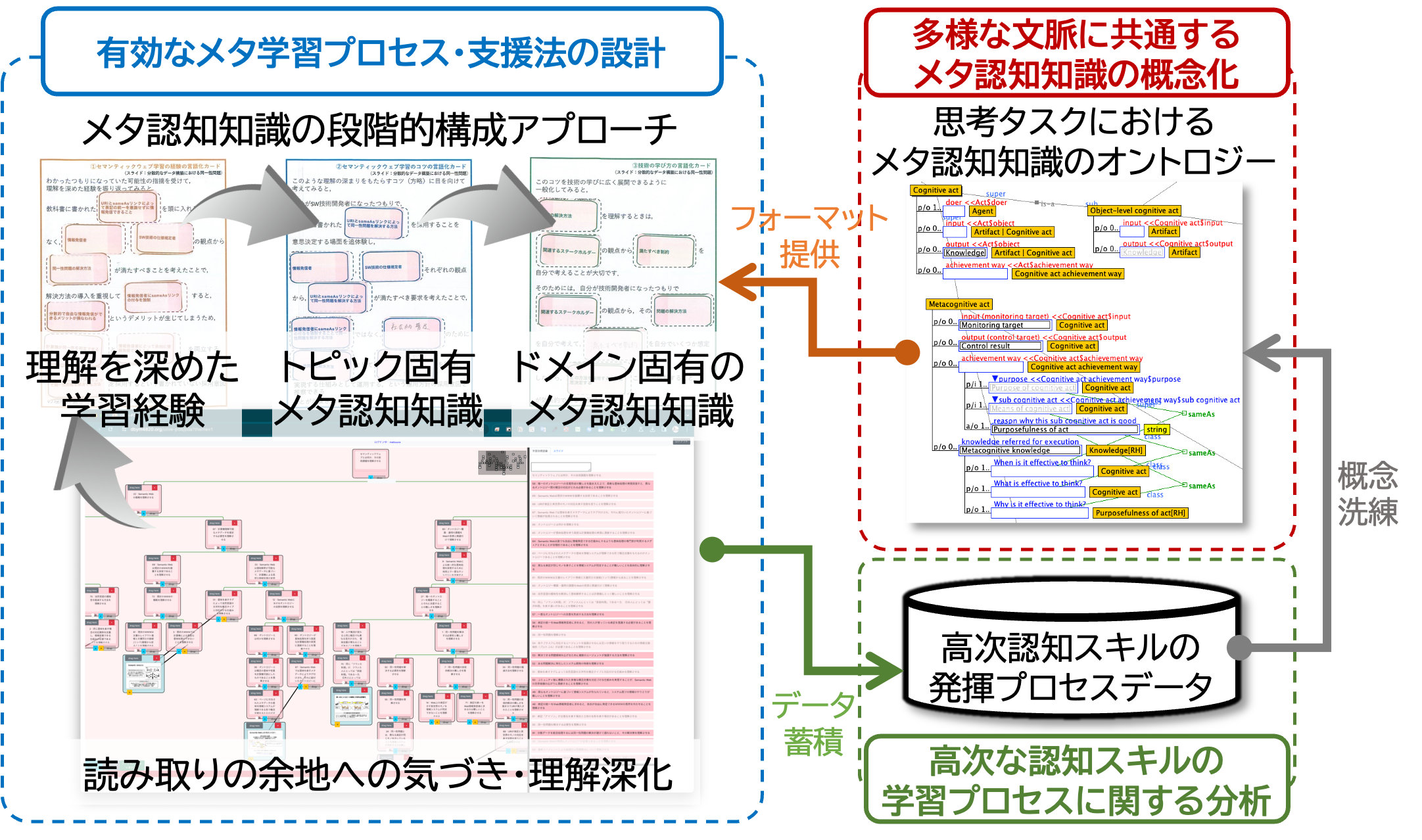 特定のタスクやトピックの内容に入り込んだレベルのメタ認知知識を計算機システムとヒトがどちらも扱えるようにする方法を模索する取り組みが中心です.